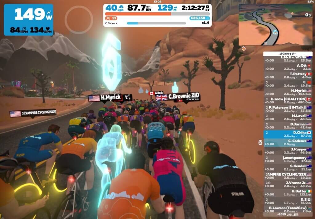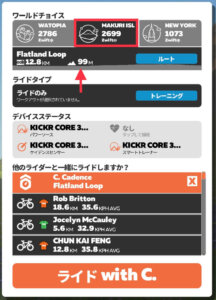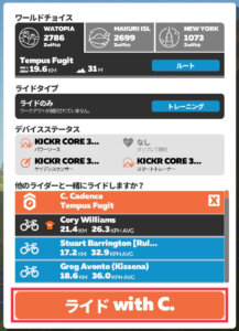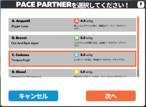 ちなみにワールドの真ん中(日替わり)でC .Cadenceさんを選択することも出来ますが獲得標高が高くなるのと集団に再合流しにくくなりますのでご注意ください。