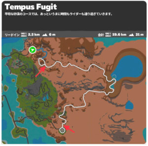 私は2)を選択しました。1)はStravaに登録するときに複数になってしまうからです。2)の場合、Watopiaで集団に再合流するのに20分くらいです。停止状態から合流するのは困難ですので、以下画像の矢印部分で停止し(ループした後)、反対方向から集団が来るのを確認して30km位で走っていれば合流しやすいです。(集団がループしている間に助走する)