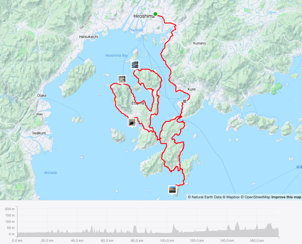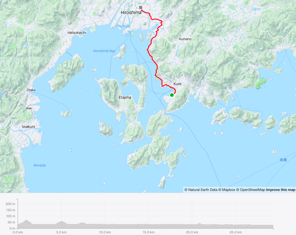そしてスタート。とりあえず他の人に着いていく。これが早くて、37km/hくらいで巡航してることもあったり。スタジアムから呉市街地に入る峠付近まで高速トレインの恩恵を受ける。