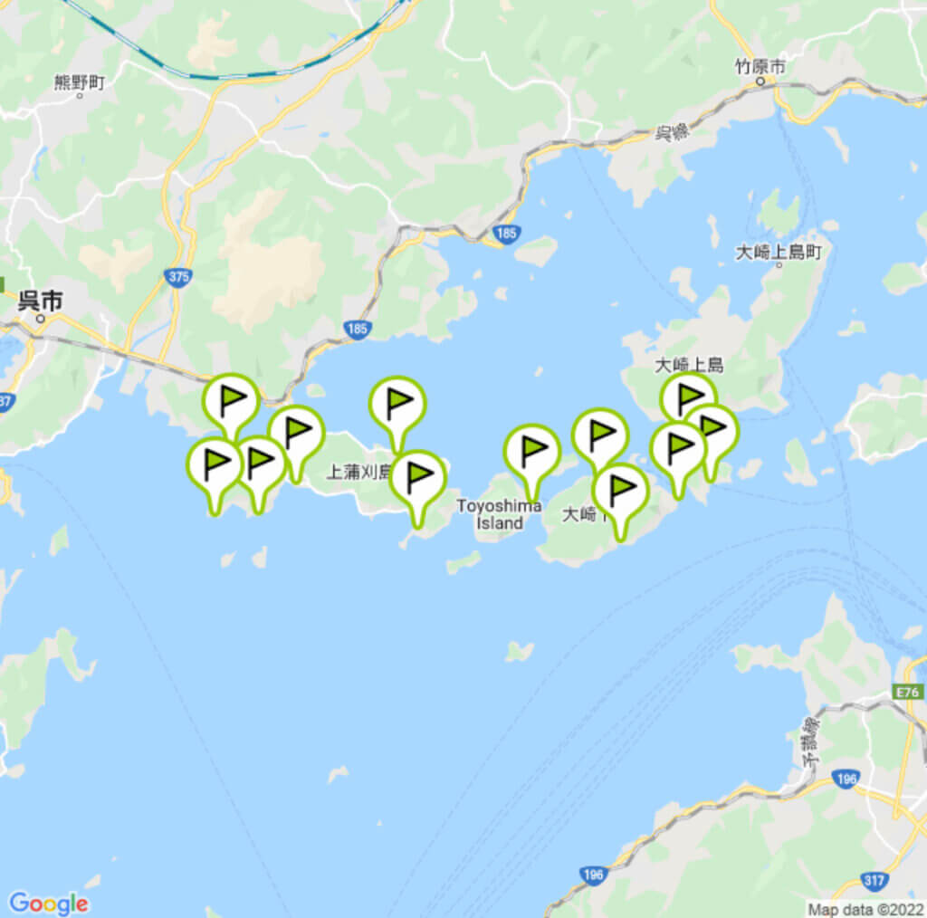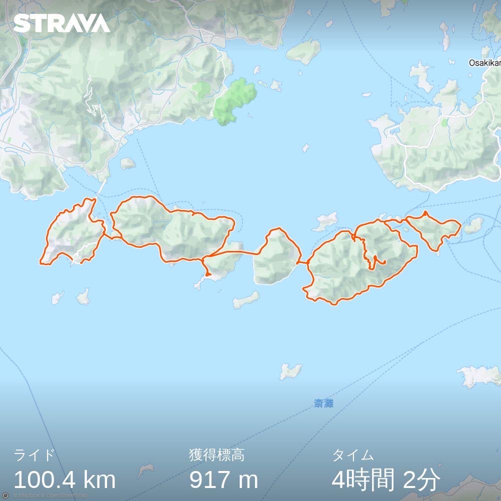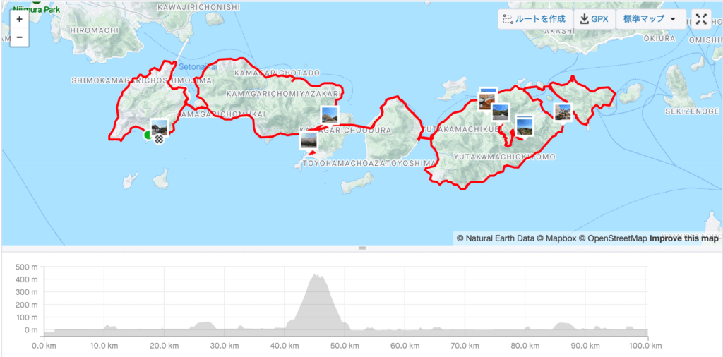 大崎下島(右から2番目の島)で一峰寺山をヒルクライムしているのですが、チェックポイントはありません。