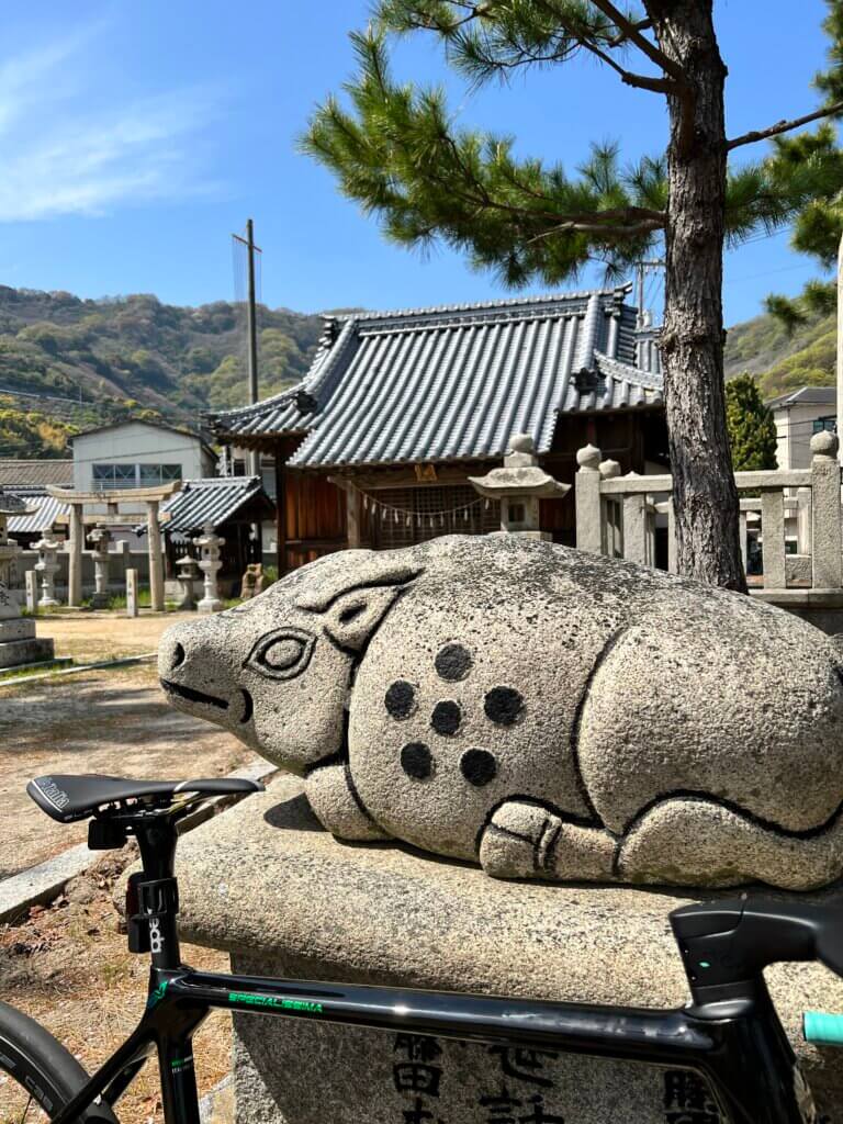 沖友天満宮を通過。神の使いとされる「天満宮の牛」と。