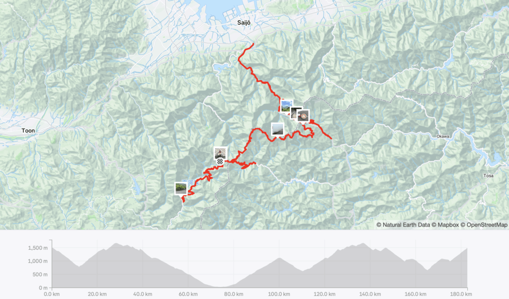 愛媛県の石鎚山にある土小屋駐車場を起点に、北側144km、南側の石鎚スカイライン36kmのアップダウンを踏破するコースです。